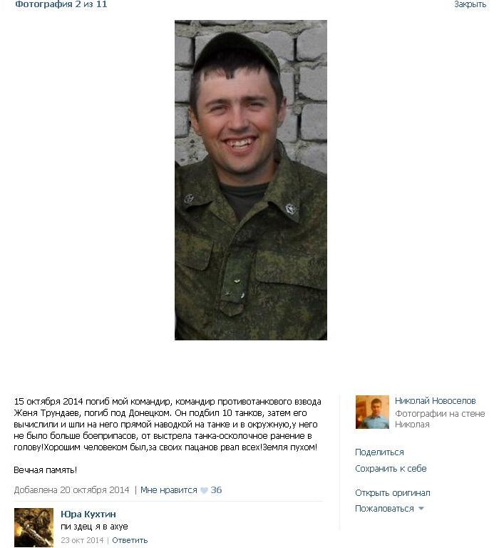 19 октября уже в сообществе "Противо танковый взвод" 200-й мотострелковой бригады ещё один бывший сослуживец Трундаева АнтонИвлев делает запись со словами "Мужики 15 октября 2014г погиб наш командир Евгений Трундаев! вечная память!"