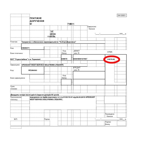 Почти синхронно - 15-17 апреля 2015 года - все эти шесть вышеназванных фирм перечислили на Кипр компании уже знакомого нам Хараламбоса Самира «APEXEAST WEST SERVICE SOLUTIONS LTD» одинаковую сумму - по 24270 долларов каждая. Общая цифра в 145620 $ была перечислена за «подбор персонала».