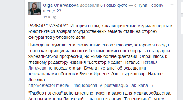 «Это стыд и позор, Наталья Львовна», - написала Ольга Червакова на своїй сторінці у соцмережі. Таким чином депутатка відреагувала на аналітичну статтю відомого журналіста Сергія Лефтера, яку опублікувало інтернет-видання «Детектор медіа»