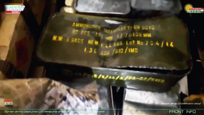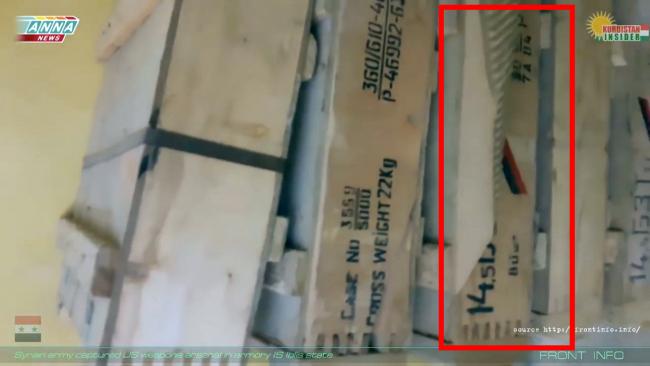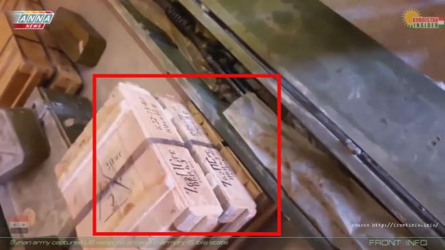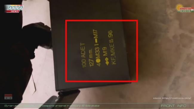 - на 2:42. Показана коробка с пулемётной лентой от патронов 12,7х99 (Браунинг) турецкого производства 1996 года выпуска. Ничего удивительного в наличии турецких патронов у всех воюющих в регионе сторон нет, так как Турецкая Армия участвует в военных операциях против ИГИЛ и в Сирии и в Ираке.