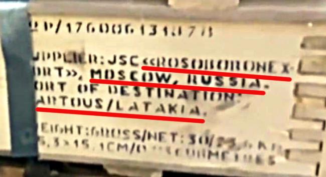 Но для начала остановимся на главном фейле русских пропагандистов. На 2.12 минуте видеокамера выхватывает патронные ящики, на которых «не по нашему написано». На самом деле, на хорошего качества древесину нанесена маркировка с выходными данными отправителя: «Рособоронэкспорт. Москва. Россия» и место получения «Тартус/Латакия».