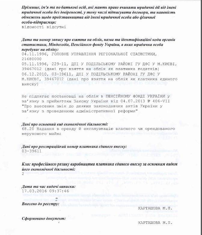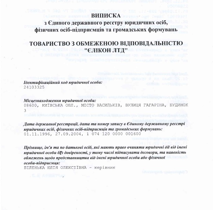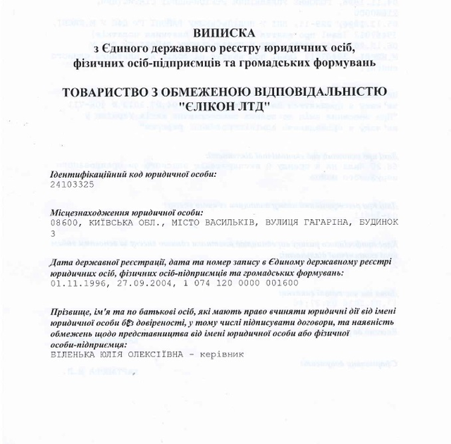В ході розслідування, у наше розпорядження потрапила виписка з Єдиного реєстру юридичних осіб, яку подаємо нижче. Згідно з зазначеною інформацією станом на сьогодні керівником, тобто людиною, яка має право вчиняти будь-які юридичні дії від імені компанії ТОВ «Єлікон ЛТД» є Біленька Юлія Олексіївна — відома в Україні бізнес-вумен, директор мережі АЗС LUXWEN.