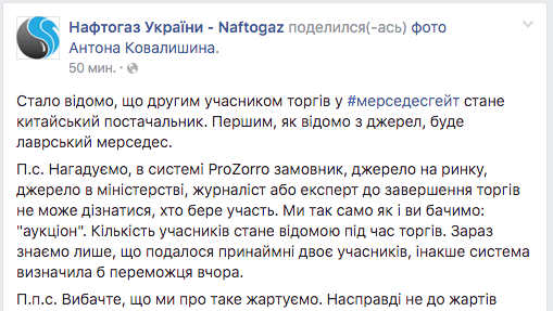 В самом конкурсе изначально было трое участников. В "Нафтогазе" заявили, что один из них - это компания Premiumavto, разместившаяобъявление о продаже авто на специализированном сайте. Еще один участник - китайский. О третьем в компании ничего не знали.