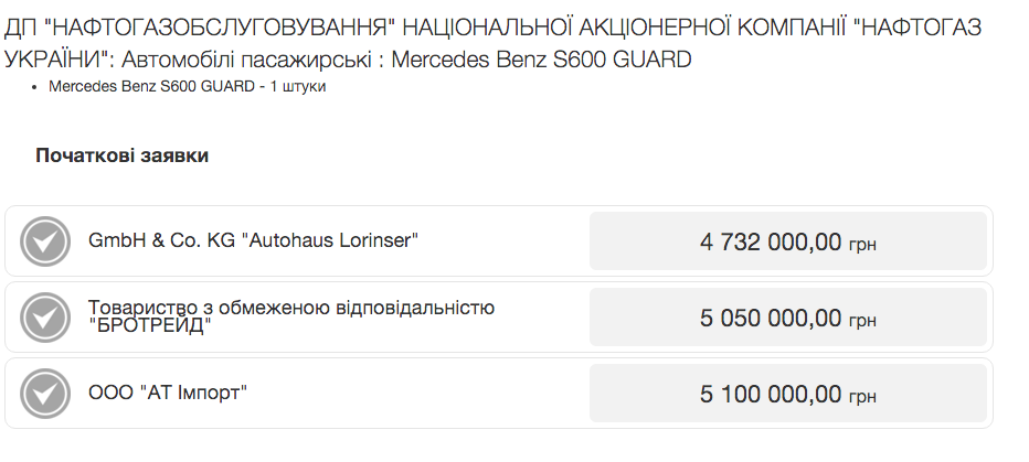 В конкурсе на поставку бронированного автомобиля премиум-класса Mercedes Benz S600 Guard для главы НАК "Нафтогаза" выиграла компания "АТ Импорт", предложившая машину Андрею Коболеву за 4,5 миллиона гривен.