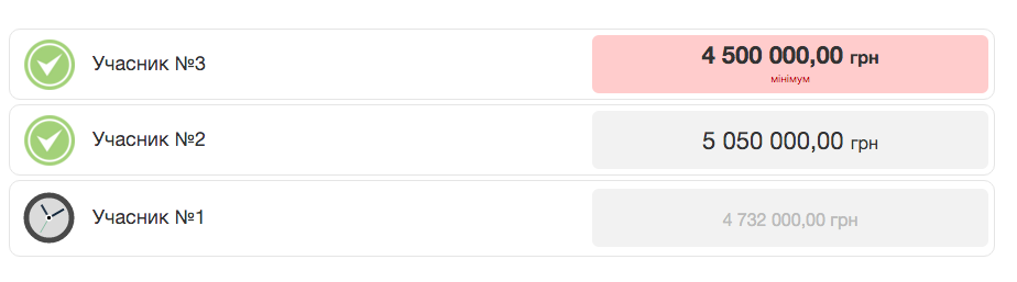 Участники аукциона были обнародованы после его окончания. Один из них заявил сумму в 5,1 миллиона гривен, как и говорилось при объявлении торгов. Двое других участников с самого начала торгов предложили суммы меньше. Участник №1 подал предложение на 4,732 млн грн, а участник №2 - на 5,05 млн гривен.