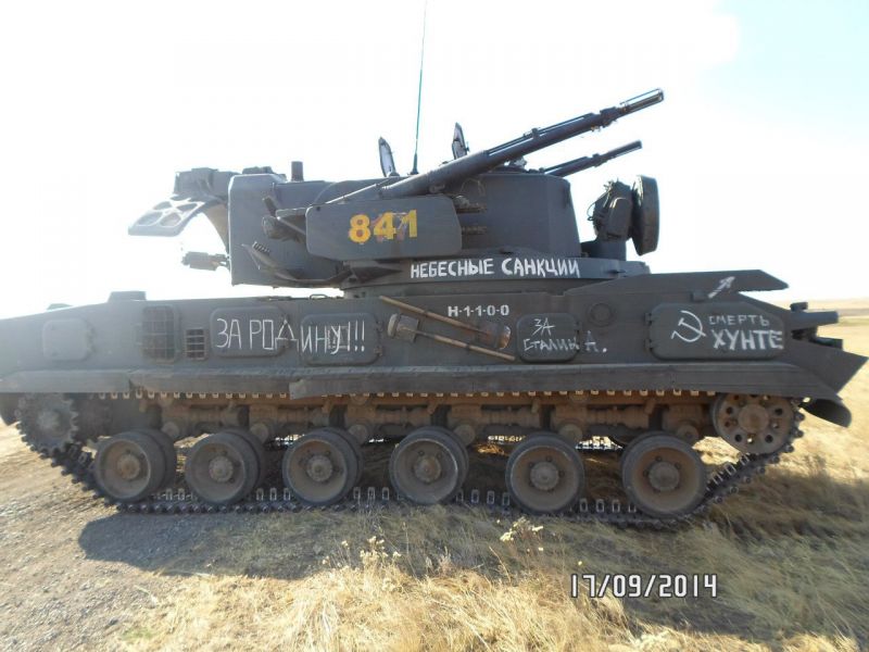 Зенитная самоходная установка 2С6 "Тунгуска" бортовой номер "841" - боевая машина 200-й ОМСБр ВС РФ, на которой нанесено самое большое количество надписей: с правой стороны "Небесные санкции", "За Родину !!!", "За Сталина", "Смерть хунте", с левой - "За чистое небо", "Привет киевским летчикам".