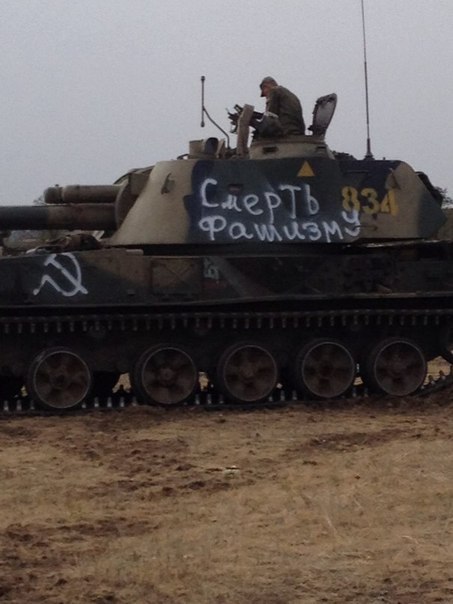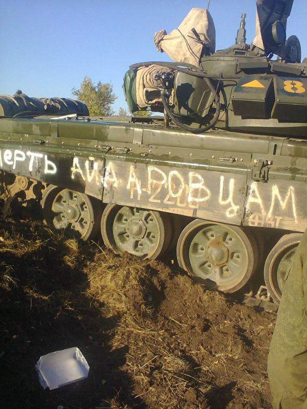 Фото зенитного комплекса "Стрела-10" с надписью "СМЕРТЬ ФАШИСТАМ АЙДАРА!!!" на правой стороне корпуса - это один из кадров работника военно-ремонтного завода Михаила Боюрова, опубликовавшего на своей странице "ВКонтакте" серию фотографий боевой техники 200-й ОМСБр периода осени 2014 года.