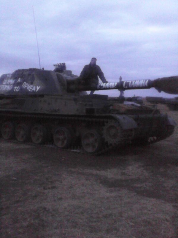 Фотографии самоходной артиллерийской установки 2С3 бортовой номер "834" с надписями: "Кулак Сталина" на стволе, "Не шуми, а то приеду" с правой стороны башни, "Смерть Фашизму" и опознавательным желтым треугольником на левой стороне башни.