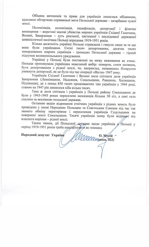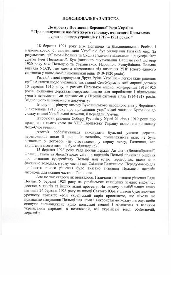 Сьогодні я зареєстрував проект Постанови про вшанування пам’яті жертв геноциду, вчиненого Польською державою щодо українців у 1919 - 1951 роках (№5012). Правда має бути вичерпною. Правда не може бути однобокою. Уроки історії мають бути визубрені усіма. Це щеплення від повторень.