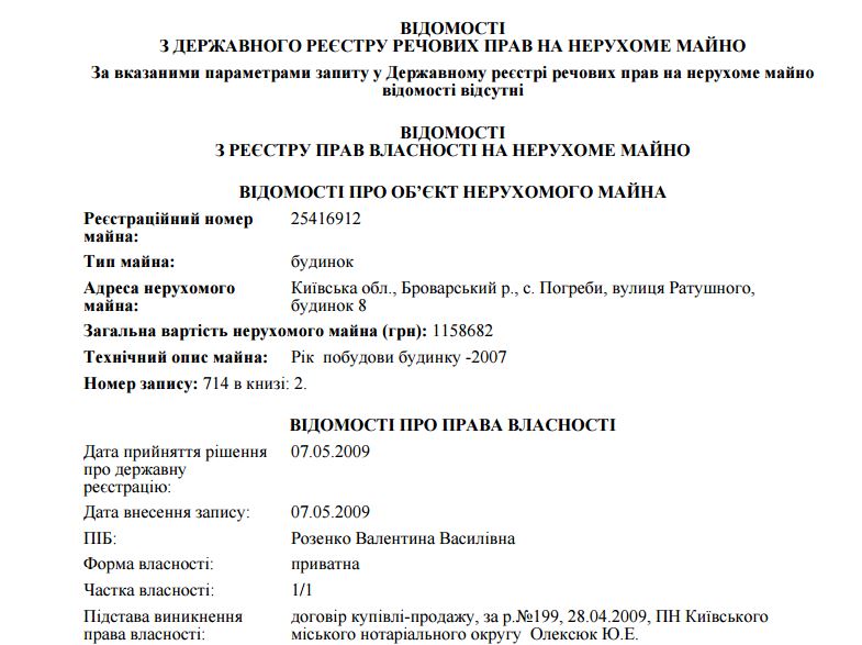 Официально акт купли-продажи в 2009 году оформлен на маму высокопоставленного чиновника — Валентину Васильевну Розенко. Об этом свидетельствует выписка из реестра прав на недвижимое имущество, которая есть в распоряжении журналистов.