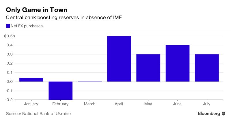 "Мы активно покупаем иностранную валюту с апреля, с того момента, как конъюнктура мирового рынка стала для нас благоприятной", - говорит Олег Чурий, заместитель главы Национального банка, отвечающий за валютную политику. "Участие в программе МВФ могло бы стимулировать иностранные инвестиции, и позволили бы нам более активно пополнять свои резервы".
