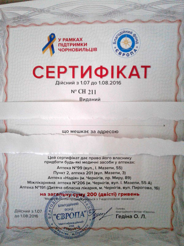 В последний день перед голосованием от фонда «Европа», учредителем которого является действующий нардеп от «Батькивщины» Валерий Дубиль, в Чернигове раздавали сертификаты на 200 гривен на получение лекарств.