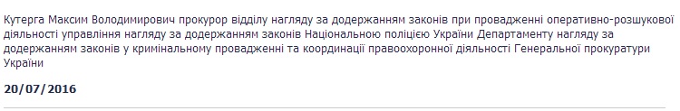 - назначенный 20 июля на пост прокурора отдела надзора за соблюдением законов при осуществлении оперативно-розыскной деятельности управления надзора за соблюдением законов Национальной полицией Украины Департамента надзора за соблюдением законов в уголовной призводстве и координации правоохранительной деятельности ГПУ Максим Кутерга;
