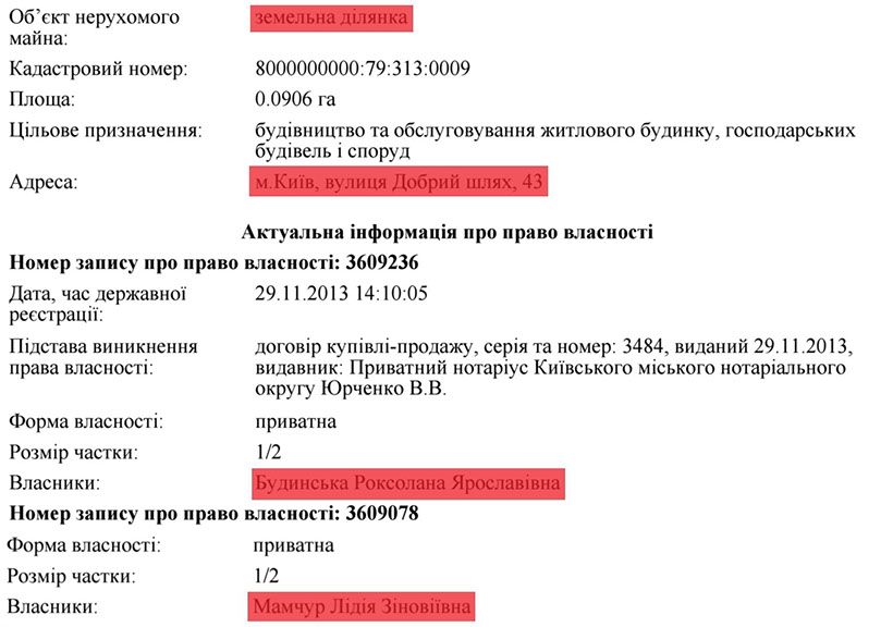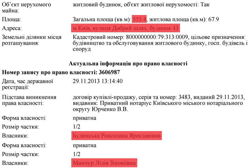 Так, дружина та дочка пана Мамчура з 2013р. мають у власності на двох земельну ділянку площею 0,09 га та величезний будинок на 555м² в Голосіївському районі Києва.