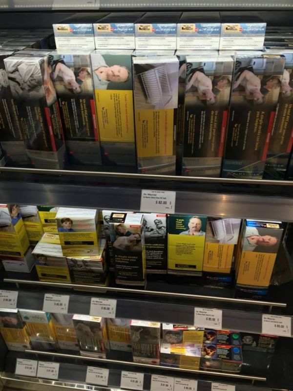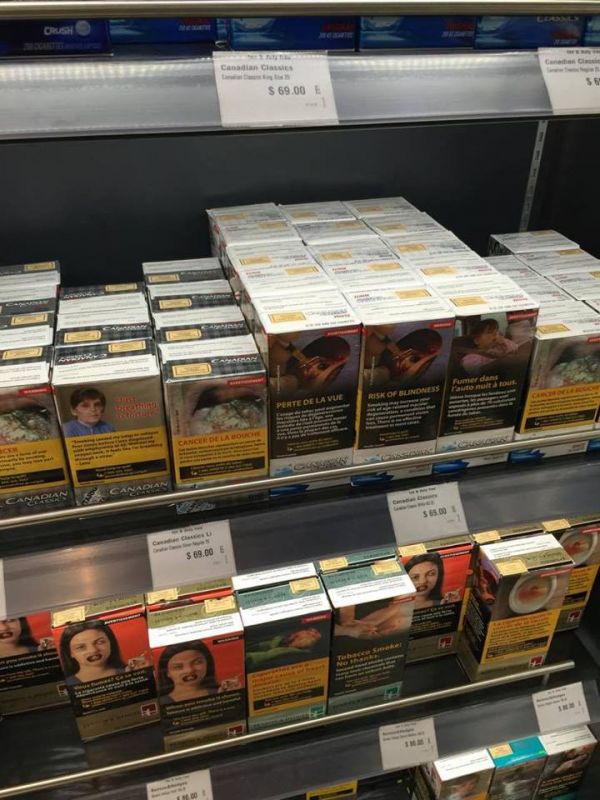 Ось так моторошно виглядають пачки цигарок на прилавках магазинів у Торонто.