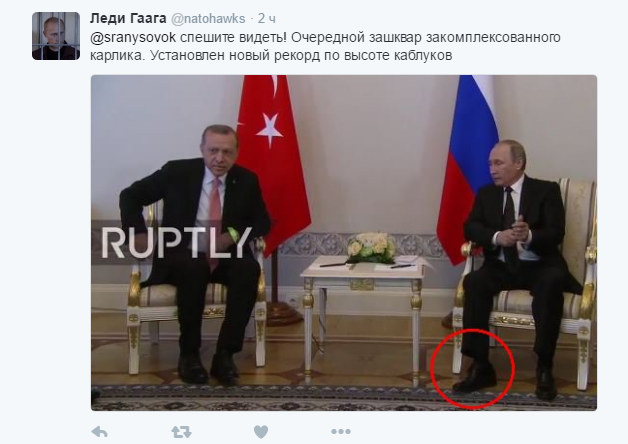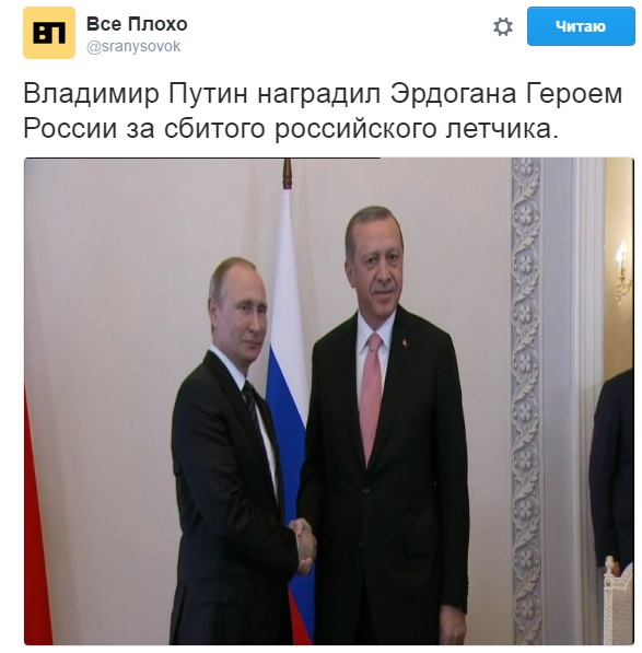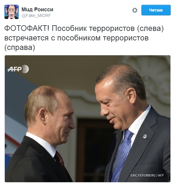 Пользователи социальных сетей обсуждают фото с встречи двух лидеров и отмечают: «Фотофакт! Владимир Владимирович поймал за руку пособника международного терроризма!», «Путин выдаст Эрдогану бульдозеристов, которые давили турецкие помидоры», «Пранкеры Вован и Лексус разыграли друг друга», «Будет Эрдоган публично целовать туфель Путину или нет?», «Бедный Вова, как ты жалок, что же ты так стесняешься своего роста неполноценный ты наш... Кресло, кресло, ха ха», «Нет, это президент, который возвращает стабильность и духовность поймал за руку пособника международного терроризма!», «Русский летчик угнал самолет и летел бомбить турецких детей», «Вдова летчика попросила наградить Эрдогана», «Керченский мост переименовать в мост Эрдогана».
