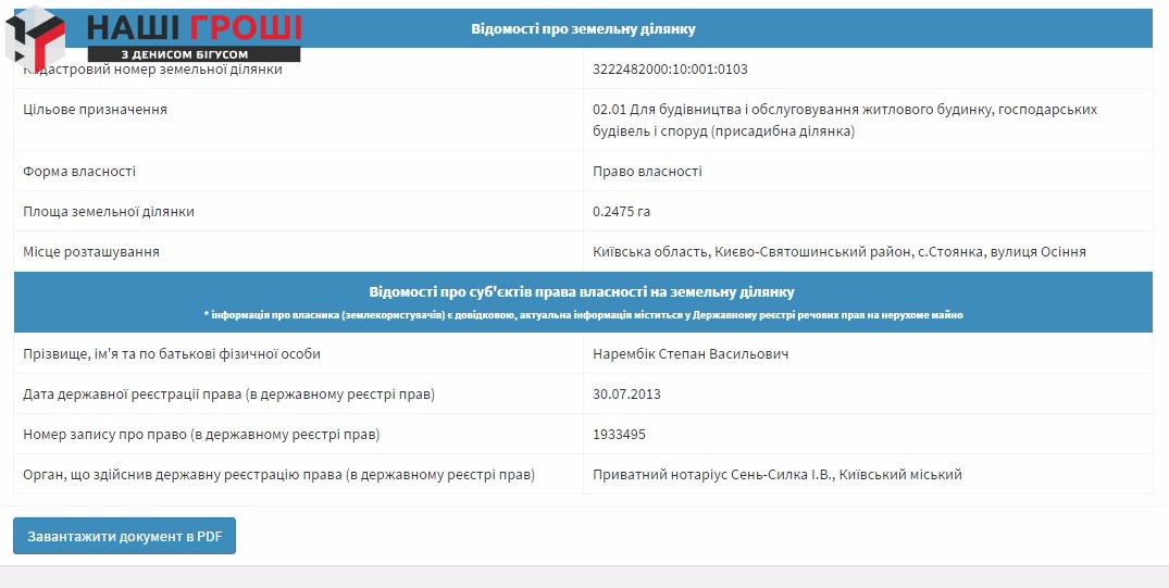 Раніше журналісти "Наших грошей з Денисом Бігусом", вже розповідали про іншого власника маєтків у Стоянці, Віктора Червоного. Екс-голова Державного комітету лісового господарства України також володіє там двома будинками, які розміщені  на кількох ділянках загальною площею щонайменше 2,7 га: чотири ділянки землі на гектар оформлено на самого Віктора Червоного, ще дві ділянки на пів гектара – на дружину, а також мінімум по одному паю мають син і дочка.