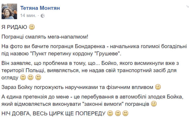 "Погранцы забрали у меня заграничный паспорт и не отдают, ссылаясь на то, что СБУ внесло меня в какую-то базу. Дозвонилась этим уродам - они не в курсе, что случилось, и не знают, куда мне еще можно было бы позвонить и узнать. Гебня, вы клинические уроды. Сдохнете в муках, животные. Интересно, какая мразь и на каком основании внесла меня в эту неизвестную базу", - написала Монтян.