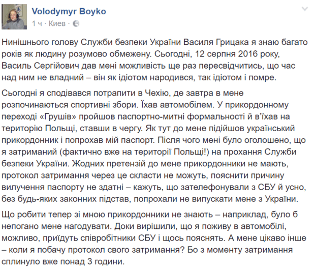 "Сегодня я надеялся попасть в Чехию, где завтра у меня начинаются спортивные сборы. Ехал на автомобиле. В пограничном переходе "Грушев" прошел паспортно-таможенные формальности и въехал на территорию Польши, стал в очередь. Как тут ко мне подошел украинский пограничник и попросил мой паспорт. После чего мне было объявлено, что я задержан (фактически уже на территории Польши!) По просьбе Службы безопасности Украины. Никаких претензий ко мне пограничники не имеют, протокол задержания поэтому составить не могут, объяснить причину изъятия паспорта не способны - говорят, что позвонили из СБУ и устно, без каких-либо законных оснований, попросили не выпускать меня из Украины", - сообщил Бойко.
