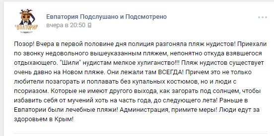 13. Полицаи в Евпатории обезвредили еще одно ДРГ — на этот раз нудистское: “Позор! Вчера полиция разгоняла пляж нудистов! Приехали по звонку недовольного вышеуказанным пляжем. “Шили” нудистам мелкое хулиганство!!! Пляж нудистов существует очень давно на Новом пляже. Они лежали там ВСЕГДА! Причем это не только любители позагорать и поплавать без купальных костюмов, но и люди с псориазом. Которые не имеют другого выхода, как загорать под солнцем, чтобы избавить себя от мучений хоть на часть года до следующего лета!