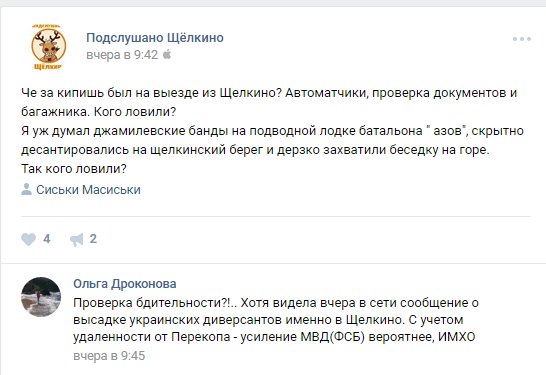5. Одни ватники в Щёлкино слышали, что украинские диверсанты зашли с моря именно к ним в город. У других в Щёлкино так коленки трясутся, что блокпост оккупантов с автоматами на выезде из города приняли за “джемилевскую банду”, которая прибыла на подлодке полка “Азов”.