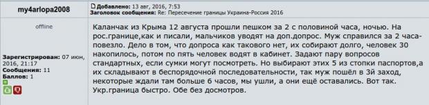 7. На ватофоруме делятся впечатлениями о том, как сейчас шмонают на российской “границе”, устраивая допросы с пристрастием о целях поездки на материковую Украину (скрин). Оккупанты подтверждают, что пункты пропуска со стороны Крыма (на выезд) перегружены.