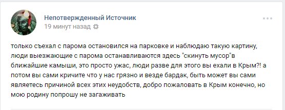 Крымчане возмущены, что туристы-оккупанты, съезжая с парома, тут же выбрасывают мусор из машины на обочину дороги (скрин). Мусорить продолжают и в местах своих попоек.