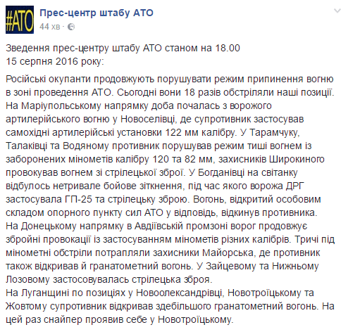 Также на мариупольском направлении сутки началась из вражеского артиллерийского огня в Новоселовке, где террористы применили самоходные артиллерийские установки 122 мм калибра. В Тарамчуке, Талаковке и Водяном стреляли из запрещенных минометов калибра 120 и 82 мм, а защитников Широкино провоцировали огнем из стрелкового оружия.