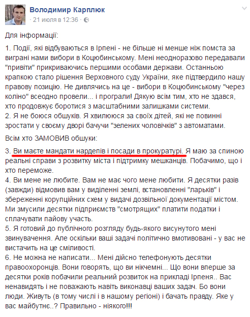 «Я знал, что будет обыск и прокуратура будет искать документы по земельному участку в Ирпене размером 15 га. Это участок в центре города и находится в коммунальной собственности Ирпеня. Несколько месяцев назад ко мне обратился скандально известный экс-депутат Киевского городского совета и экс-заместитель по земельным вопросам мэра Киева Леонида Черновецкого - Луцкий Александр Ефимович. Он предложил мне принять участие в коммерческом проекте с целью многоэтажной застройки земельного участка в Ирпене по улице Соборная размером 15 га. Я ответил ему однозначно отказом. После этого со стороны Луцкого начались системные запугивания меня и членов моей команды, прежде всего, это были угрозы расправы руками прокуратуры Киевской области. Тогдашний прокурор Киевской области Евгений Бондаренко фактически стал исполнителем указаний одного из крупнейших коррупционеров за всю историю украинской независимости Александра Луцкого. Именно Луцкий Александр Ефимович является эталоном отечественной коррупции. Он приспосабливался к любой власти и воровал у Украины до событий на Майдане, после неё и даже во время Революции Достоинства. Он представляется советником первых лиц государства и от их имени давил на представителей местного самоуправления с целью земельного дерибана и масштабной застройки. В случае несогласия участвовать в его коррупционных схемах, Луцкий применял силовую машину Януковича - спецназовцы в масках, с автоматами и подвесными гранатами», - утверждает Карплюк.