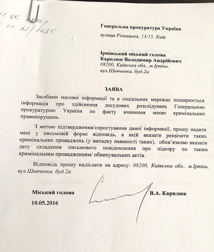 В подтверждение своих слов, Карплюк продемонтрировал общественности ответы за запросы в ГПУ, которые он посылал еще в мае, когда началась активная кампания против него и появилось прозвище «Вова67»: