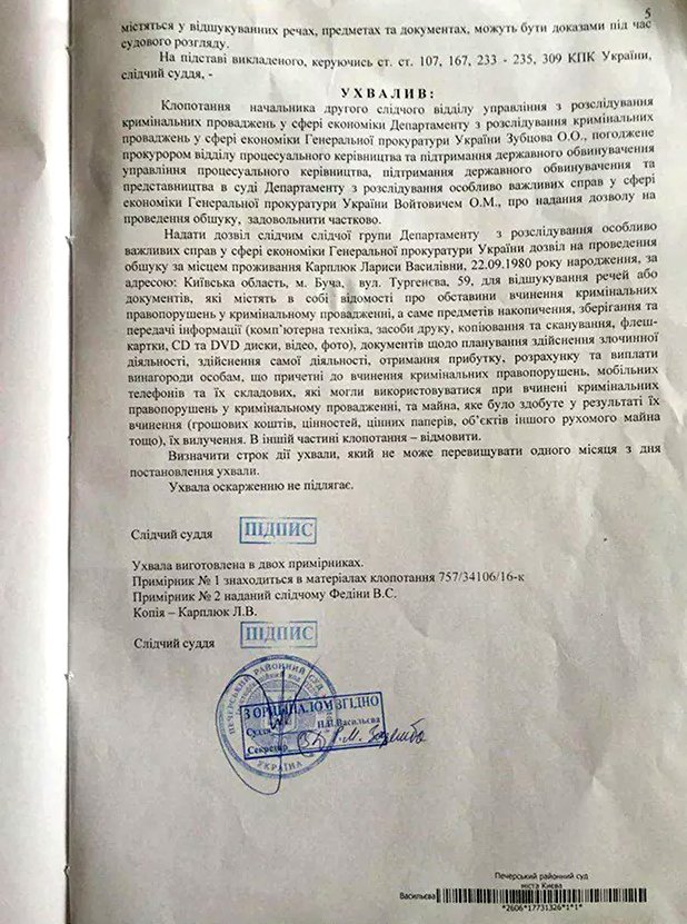 И хотя в то время обыски все ещё продолжались, начальник Департамента по расследованию особо важных дел в сфере экономики Генеральной прокуратуры Украины Владимир Гуцуляк уже отчитался об успешном ходе обысков: «обыски продуктивные и результативные - изъято большое количество документов, которые указывают, что эти земли изначально незаконно выводились, потом передавались подставным лицам, а потом с небольшим промежутком времени предоставлялась собственность в использование близким к должностным лицам Бучанского и Ирпенского горсоветов, которые дальше, с помощью своих строительных компаний, осуществляли жилую и общественную застройку».