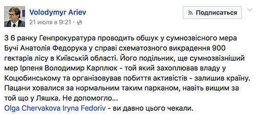 Собственно, первым о проводимых силовиками обысках в Ирпене и Буче оповестил нардеп от «БПП» Владимир Арьев: