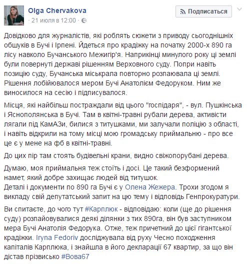 Тут и нашлось наконец объяснение: а что, собственно, происходит? Первой о деталях дела поведала общественности именно Червакова: «в 2002 году, когда Анатолий Федорук уже был мэром Бучи, местный совет незаконно изменил целевое назначение зеленых зон бывшей Бучанского лесной дачи. 890 гектаров леса первой категории бучанская власть раздерибанила под застройку. Прокуратура обратилась с иском, и в конце 2015-го года решением Верховного Суда Украины иск был удовлетворен, а земли возвращены государству. Речь идет о 890 га леса вокруг так называемого «Бучанского Межигорья» - имения экс-вице-спикера ВР, коммуниста Игоря Калетника. Решением суда лес площадью 14,0455 га также истребован в пользу государства из незаконного владения родственника Калетника. Однако, после вступления в законную силу вышеуказанных судебных решений, Бучанским городским советом были повторно приняты 7 решений о передаче в собственность земельных участков в лесу под застройку. Прокуратурой Киевской области повторно предъявлены 3 иска об их отмене и истребовании земельных участков в пользу государства. Обыски, которые сегодня происходят в Ирпене и Буче, проходят в рамках уголовного производства, возбужденного в августе 2015 года по факту злоупотребления служебным положением должностными лицами Бучанского городского совета при изъятии земель лесного фонда и изменения их целевого назначения общей площадью 890 га, с целью получения неправомерной выгоды в интересах другого физического или юридического лица вопреки интересам службы, повлекшее тяжкие последствия охраняемым законом правам, свободам и интересам государства. Расследование ведет Главное следственное управление Генеральной прокуратуры» (ч. 2 ст. 364 УК от 11 сентября 2015).