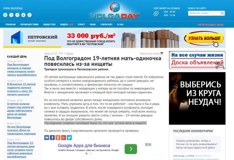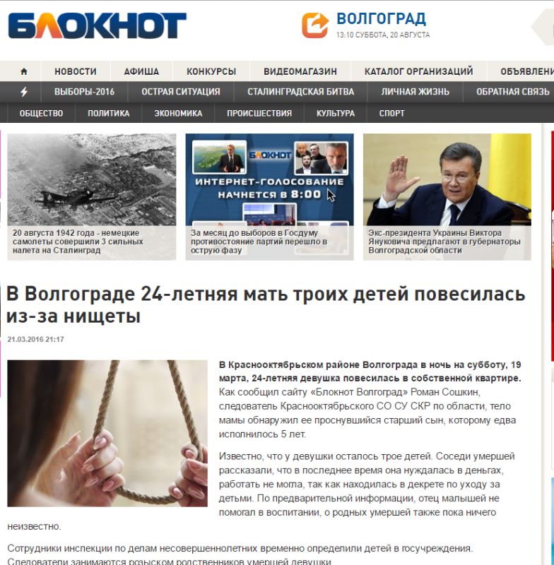 Сразу же нашлась еще одна аналогичная новость, только за март этого года. Тоже Волгоград. Из-за нищеты повесилась 24-летняя девушка, мать троих детей.