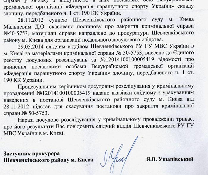 Аферисти, користуючись повною підтримкою міністерства, збирали зі спортсменів гроші з таким нахабством, що ще в 2010 році проти керівників цієї самозваної «федерації» була порушена кримінальна справа по статті «шахрайство». Щоправда, як тільки до влади прийшов двічі несудимий, тодішній міністр Сафіуллін домовився про закриття цієї кримінальної справи. Але ненадовго: 28 листопада 2012 року Шевченківський районний суд м.Києва скасував постанову про закриття кримінальної справи як незаконну й зобов’язав прокуратуру організувати досудове слідство проти керівників «Федерації парашутного спорту».