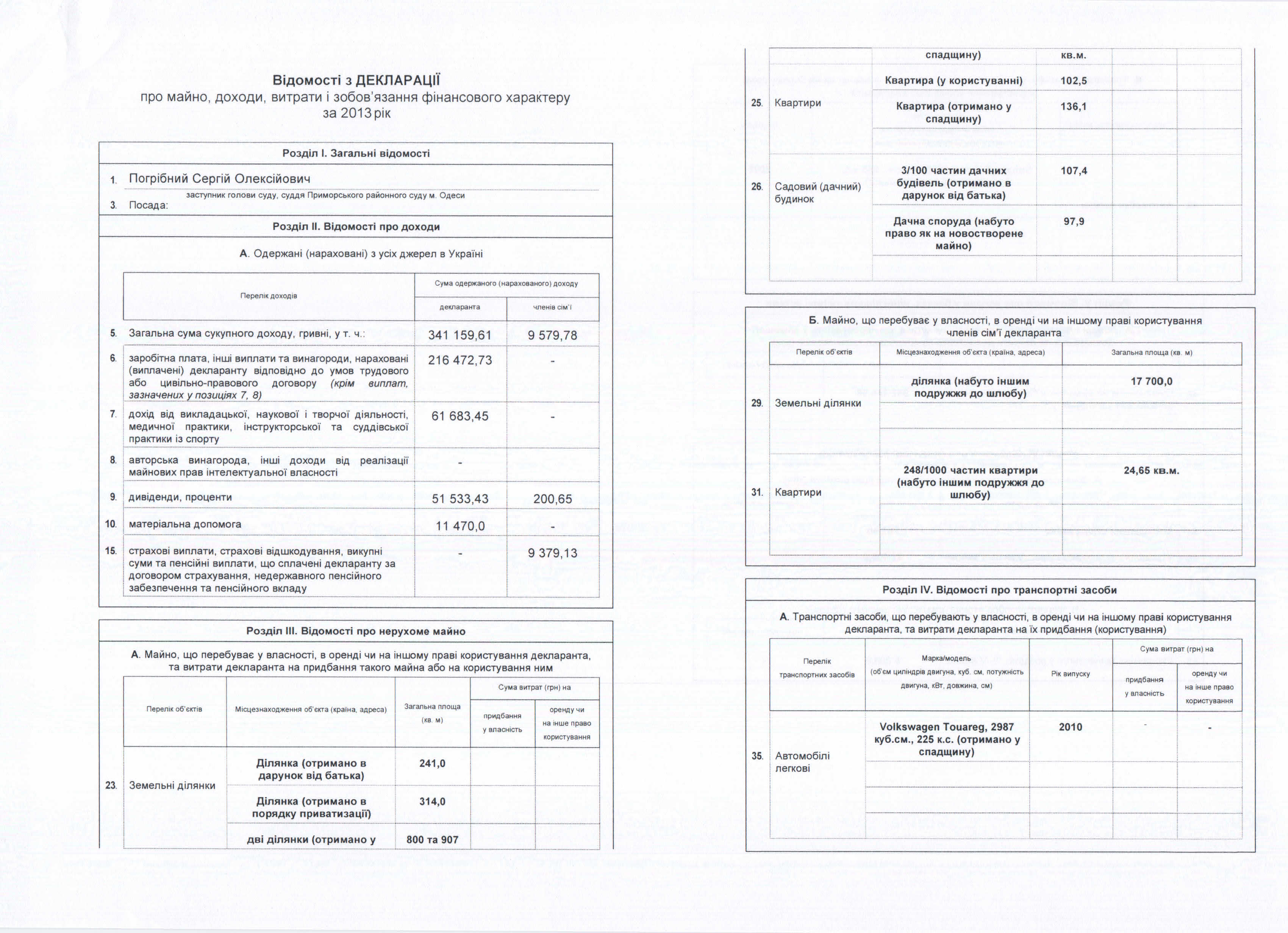 Сведения, указанные в декларациях судьи Погребного С.А.