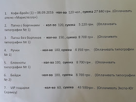 Также от имени Министерства Одесское отделение «Лиски» оплатит культурную программу. Можно еще много перечислять из всего того, что обязаны профинансировать порты… Предприятия уже получили более чем четкие указания, сколько денег и кому они должны перечислить. К примеру, за кофе-брейк для 120 участников финансовому «донору» нужно перечислить отелю «Маristella» 27 тысяч 840 гривен. То есть, кофепитие одного участника обойдется в 232 гривны. Во сколько влетит протокольная фотосъемка, печать и оформление «FamilyFoto», аренда комнат переговоров?! – эту сумму без преувеличения страшно произнести вслух, от ее величины, конечно. Только VIP-подарки для участников оценены в сумму более 40 тысяч гривен. То есть, кругом-бегом, а каждому из финансовых «доноров» придется выложить на конференцию от 100 тысяч гривен и значительно больше.