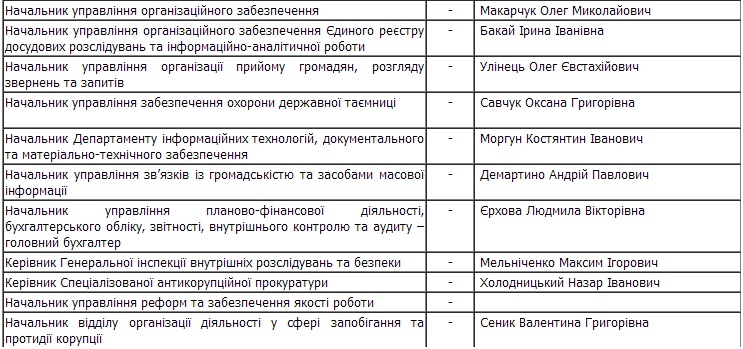 - отдельные руководители Департаментов ГПУ (в частности, главный бухгалтер ГПУ - начальник управления планово-финансовой деятельности, отчетности, контроля и аудита Людмила Ерхова и ее оруженосец-заместитель Александр Ткаченко; начальник Департамента специальных расследований Сергей Горбатюк, начальник Департамента кадровой работы и госслужбы Александр Горбань, руководитель Генеральной инспекции внутренних расследований и безопасности Максим Мельниченко, начальник Департамента процессуального руководства по уголовным производствам  следователей центрального аппарата Наталья Носова, начальник управления внутренней безопасности и защиты работников прокуратуры Иван Дзюба).