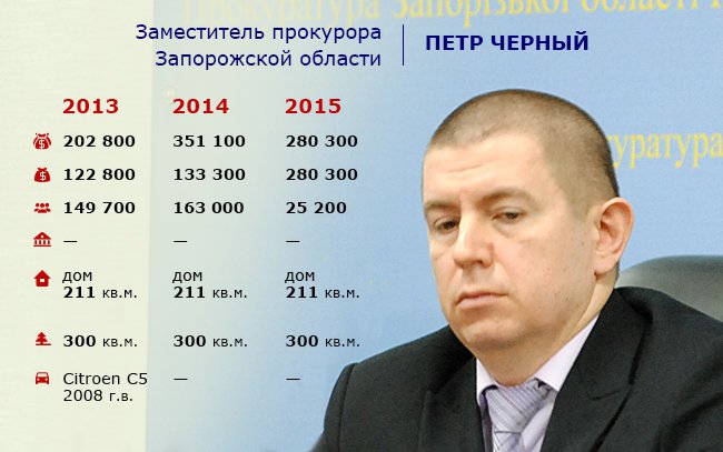 Что касается его декларации, вырисовывается четкая тенденция руководства Запорожской облпрокуратуры жить на одну зарплату. И заместитель облпрокурора Черний туда же: его прошлогодняя зарплата и весь годовой доход составляли чуть больше 280 тыс. гривен. Супруга заработала чуть больше 15 тыс. гривен.