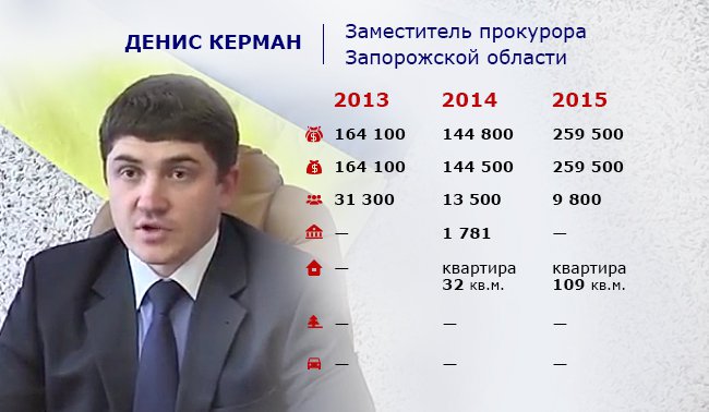 В 2014-м прокурор и вся его семья жили на 375 тыс. гривен, из которых 142,5 тыс. гривен зарплата, больше 214 тыс. гривен прибыли от продажи имущества и 17,5 тыс. гривен полученной материальной помощи.