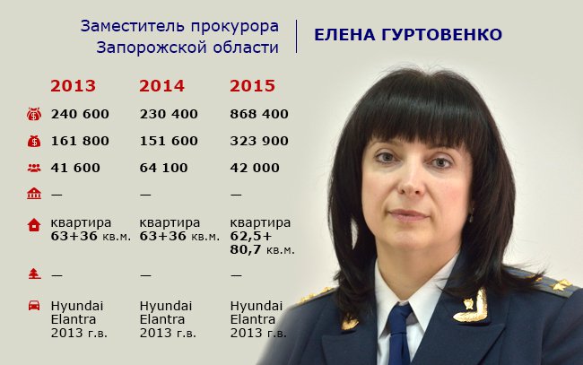 Заместитель прокурора Запорожской области Елена Гуртовенко, назначенная в конце 2014 в органах прокуратуры Запорожской области работает 21 год. Ее предыдущая должность - прокурор Орджоникидзевского района г. Запорожье. До этого 10 лет возглавляла Шевченковскую районную прокуратуру области.