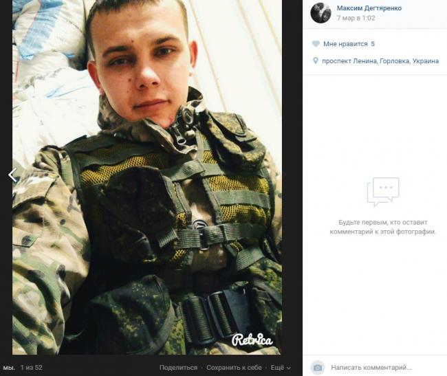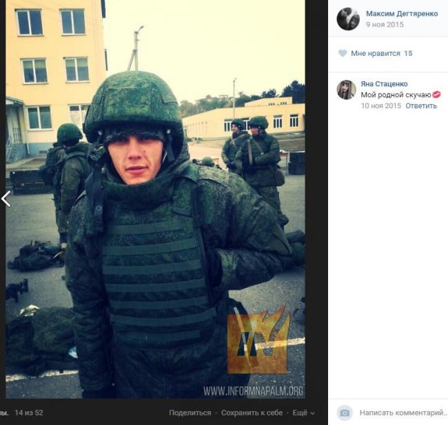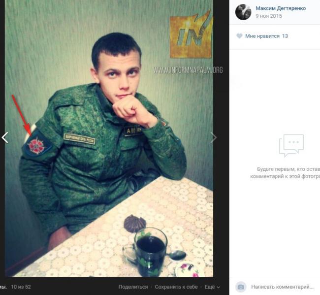 На фото отчетливо виден шеврон 22-ой бригады специального назначения ГРУ (в/ч 11659, место дислокации п. Степной, Ростовская область).»Сегодня» Дегтяренко Максим, скорее всего, перевелся в 346-ю бригаду спецназначения ГРУ, о чем говорят общие контакты и связи с вышеназванными военнослужащими.