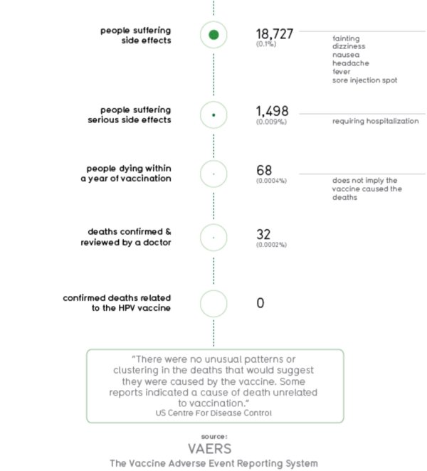 - страдавших побочными эффектами: 18 727 случаев (слабость, обморок, головокружение, тошнота, головные боли, жар, воспаление места инъекции)