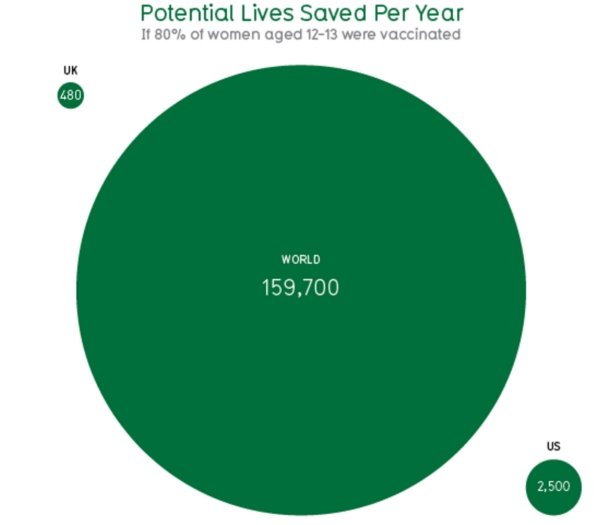 А это — сколько жизней можно сохранить, если делать прививку от папилломавируса 80% девочек в возрасте 12-13 лет (159 700 жизней во всем мире):