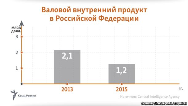 На фоне экономических проблем ВВП в 2015 сократился почти в 2 раза в долларовом эквиваленте в сравнении с доаннексионным периодом: 1,2 миллиарда против 2,1 миллиардов долларов США.
