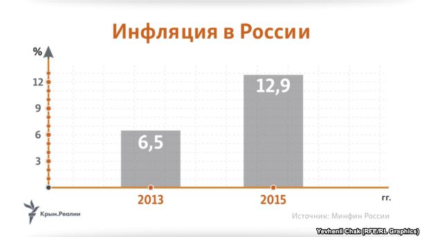 Не отстает в росте и инфляция: в 2015 году она выросла почти в 2 раза в сравнении с тем же «золотым» периодом, когда в России еще не было Крыма. По итогам 2013 года, уровень инфляции составил 6,6%, а в 2015-м - уже 12,9%.