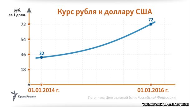Курс рубля к доллару США также упал в два раза: с 32 в начале 2014 года до 72 в начале 2016-го. В итоге, россияне стали, по меньшей мере, в два раза беднее. Но это не страшно, ведь главное, что «Крым наш».