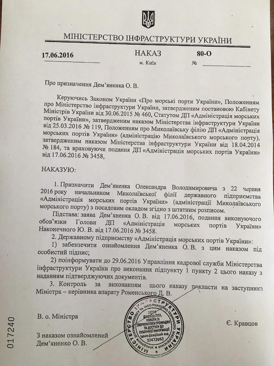 Существование «офшорной республики» оказалось под угрозой после ареста Романчука в начале лета. В течение июня своих постов лишились губернатор Вадим Мериков и прокурор области Вячеслав Кривовяз. Потом в порт назначили нового начальника администрации Александра Демьяненко – креатуру Юрия Наконечного. Демьяненко оказался «не в схеме», и сразу попал под пресс критики местных СМИ, организованной портовой мафией. В Николаеве еще надеялись на сохранение «республики», и были возмущены, что министр Владимир Омелян не согласовал кандидатуру Демьяненко с уважаемой «местной общественностью». По отзывам сотрудников порта, Василий Николаевич не сдерживал себя в выражения по поводу молодого и «зеленого» министра Омеляна, «далекого от понимания работы отрасли».