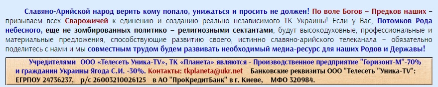 "На своем телеканале властелин Родной земли - украинец, русский, белорус найдет благодатное зерно разума, которое посеет в его страждущей душе ростки будущего Разумного прозрения!".