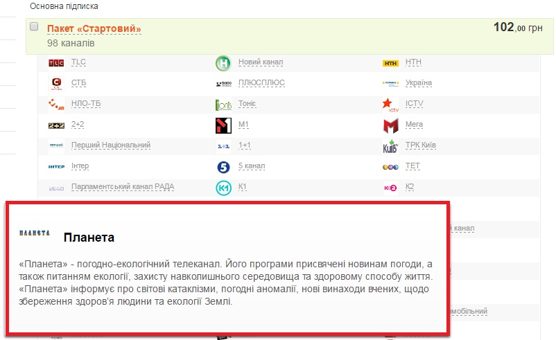 "Планета - погодно-екологічний телеканал. Його програми присвячені новинам погоди, а також питанням екології, захисту навколишнього середовища та здоровому способу життя. «Планета» інформує про світові катаклізми, погодні аномалії, нові винаходи вчених, щодо збереження здоров’я людини та екології Землі".
